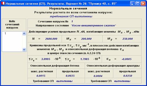 В результатах представлены кривизны 1/rx, 1/ry в плоскости действия изгибающих моментов соответственно Mx, My, а также относительная деформация волокна ε0 в центре тяжести сечения. Используя эти данные, проверку проводят в следующем порядке: 1. По формулам (6.39), (6.40) СП находят относительные деформации εbi в бетоне и εsi в арматуре; 2. По принятым диаграммам состояния находят напряжения σbi в бетоне и σsi арматуре; 3. По формулам (6.45), (6.46) СП находят коэффициенты упругости νbi бетона и νsi арматуры; 4.